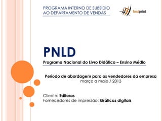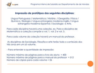 O documento descreve um programa interno de subsídio para o departamento de vendas de uma editora. O programa irá subsidiar a impressão de protótipos de livros didáticos para o ensino médio, cobrindo diversas disciplinas, para que os vendedores possam apresentá-los a potenciais clientes entre março e maio de 2013.
