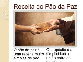 A receita do Pão da Paz usa ingredientes bíblicos como trigo, fermento, sal, açúcar e água quente para representar conceitos como a Palavra de Deus, amor, testemunho, alegria e fervor. Após amassar, descansar e assar o pão, ele é dividido entre os irmãos para representar a compartilha definida na Bíblia.