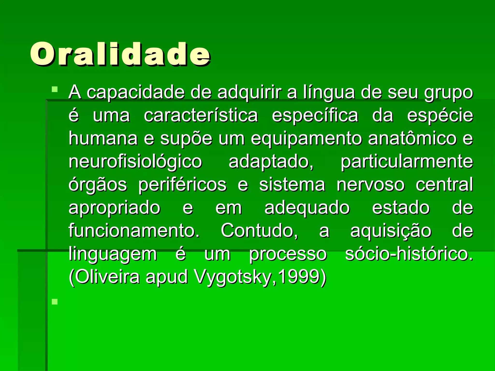 O documento discute a importância da oralidade na aquisição da linguagem e no desenvolvimento do pensamento. Aprende-se a linguagem através da interação social e ela possui funções de interação e pensamento generalizado. A escola deve valorizar a oralidade da mesma forma que a escrita, respeitando a variedade dialetal e sem discriminar formas de fala.