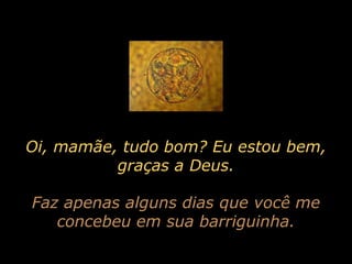 O documento é uma carta fictícia de um feto para a mãe descrevendo seu desenvolvimento no útero e expressando confusão e medo durante um aborto. A carta cobre desde a concepção até anos depois, quando o feto observa a mãe ainda chorando pela decisão. O documento promove uma narrativa pró-vida contra o aborto.