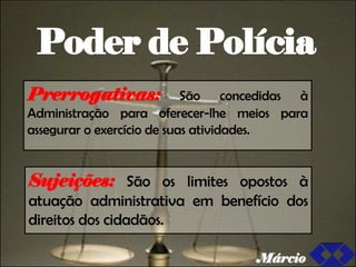 O documento discute o poder de polícia da administração pública. (1) É a prerrogativa da administração de limitar direitos individuais em benefício do interesse público, (2) está sujeito a limites como legalidade e proporcionalidade, (3) envolve poderes discricionários da administração dentro da lei para tomar decisões.