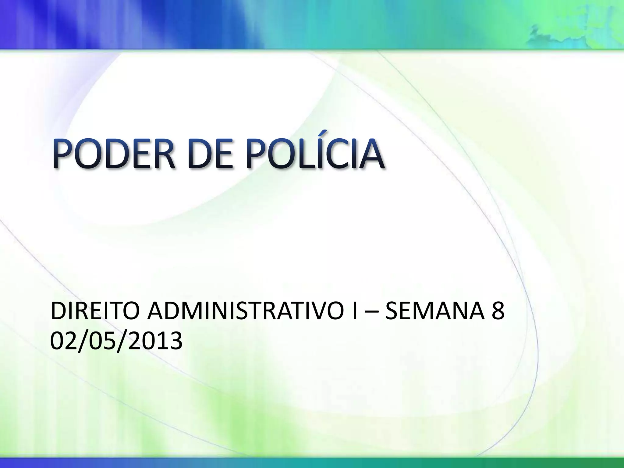 O documento discute o conceito e os fundamentos do poder de polícia, definido como a prerrogativa da administração pública de restringir liberdades e propriedades em favor do interesse coletivo. Também aborda as bases legais, finalidades, limites, formas de atuação e requisitos de legitimidade deste poder do Estado.