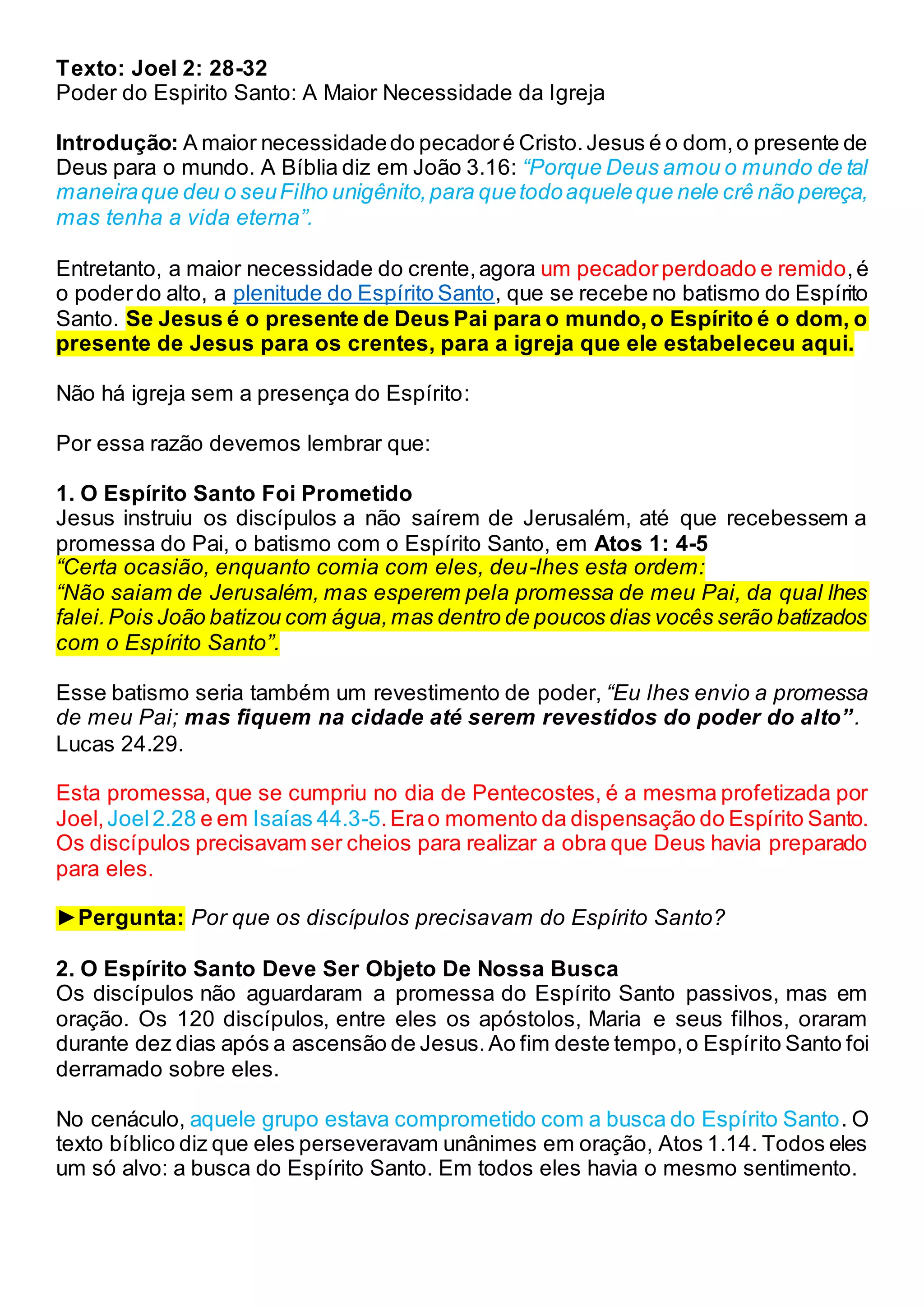 Este documento discute a importância do Espírito Santo para a igreja. Ele afirma que (1) o Espírito Santo foi prometido por Jesus e cumpriu essa promessa no dia de Pentecostes, (2) os discípulos buscaram ativamente o Espírito Santo por meio da oração, e (3) quando o Espírito Santo foi derramado, ele deu poder e vida plena aos discípulos e à igreja.