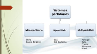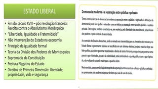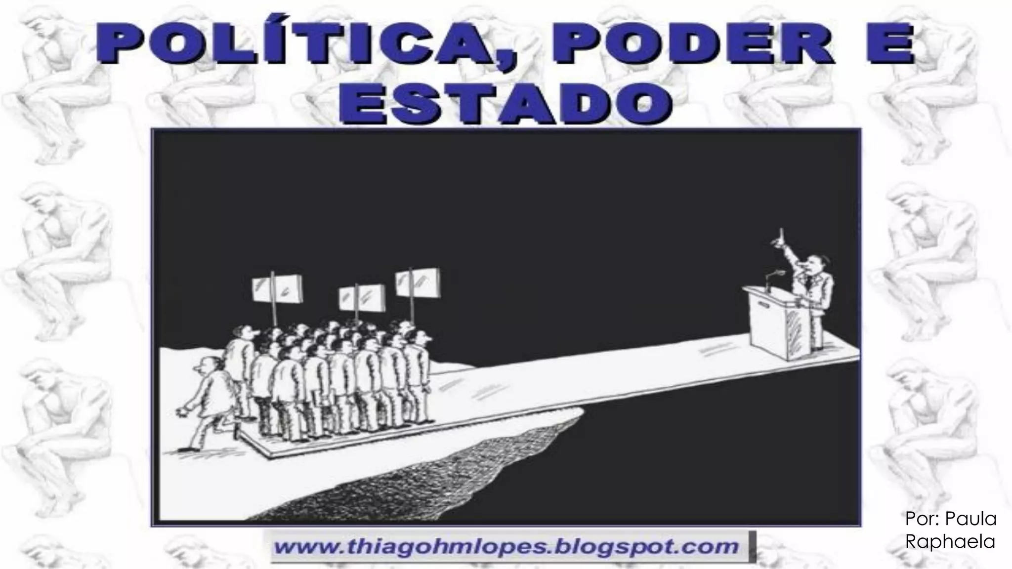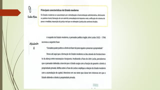 O documento discute conceitos de poder e suas formas de exercício na sociedade, mencionando exemplos como as relações de poder entre pais e filhos, professores e alunos, policiais e cidadãos. Também aborda definições de Estado segundo autores como Max Weber e discute elementos constitutivos do Estado moderno e diferentes tipos de Estados.