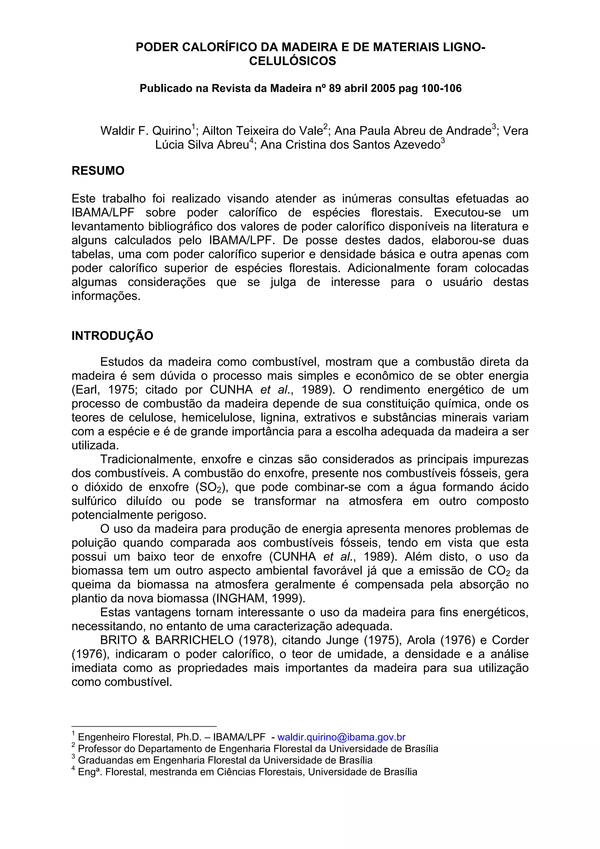 Este documento apresenta valores de poder calorífico superior e densidade básica de madeiras de espécies florestais brasileiras, com dados coletados de literatura e testes de laboratório. Duas tabelas são fornecidas, uma com 108 espécies contendo ambas as métricas, e outra com poder calorífico superior de outras 132 espécies. Considerações sobre fatores que influenciam essas propriedades, como umidade e composição química, também são discutidas.