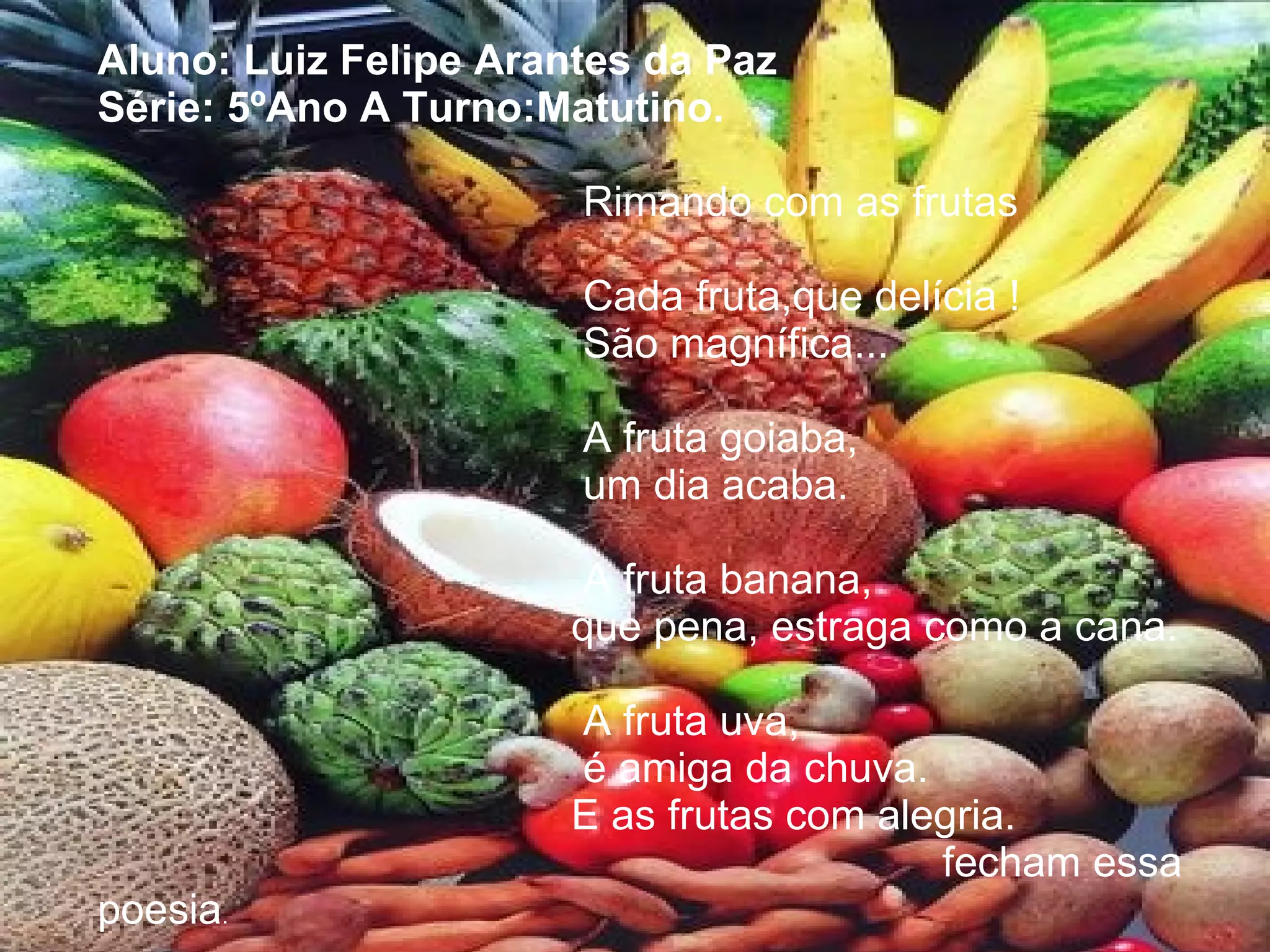 Este documento contém várias poesias e textos criados por alunos da 5a série A sobre temas como frutas, o mundo, cores, horas do dia, animais de estimação, amizade e natureza. As obras abordam de forma simples e criativa esses tópicos do cotidiano e da infância.