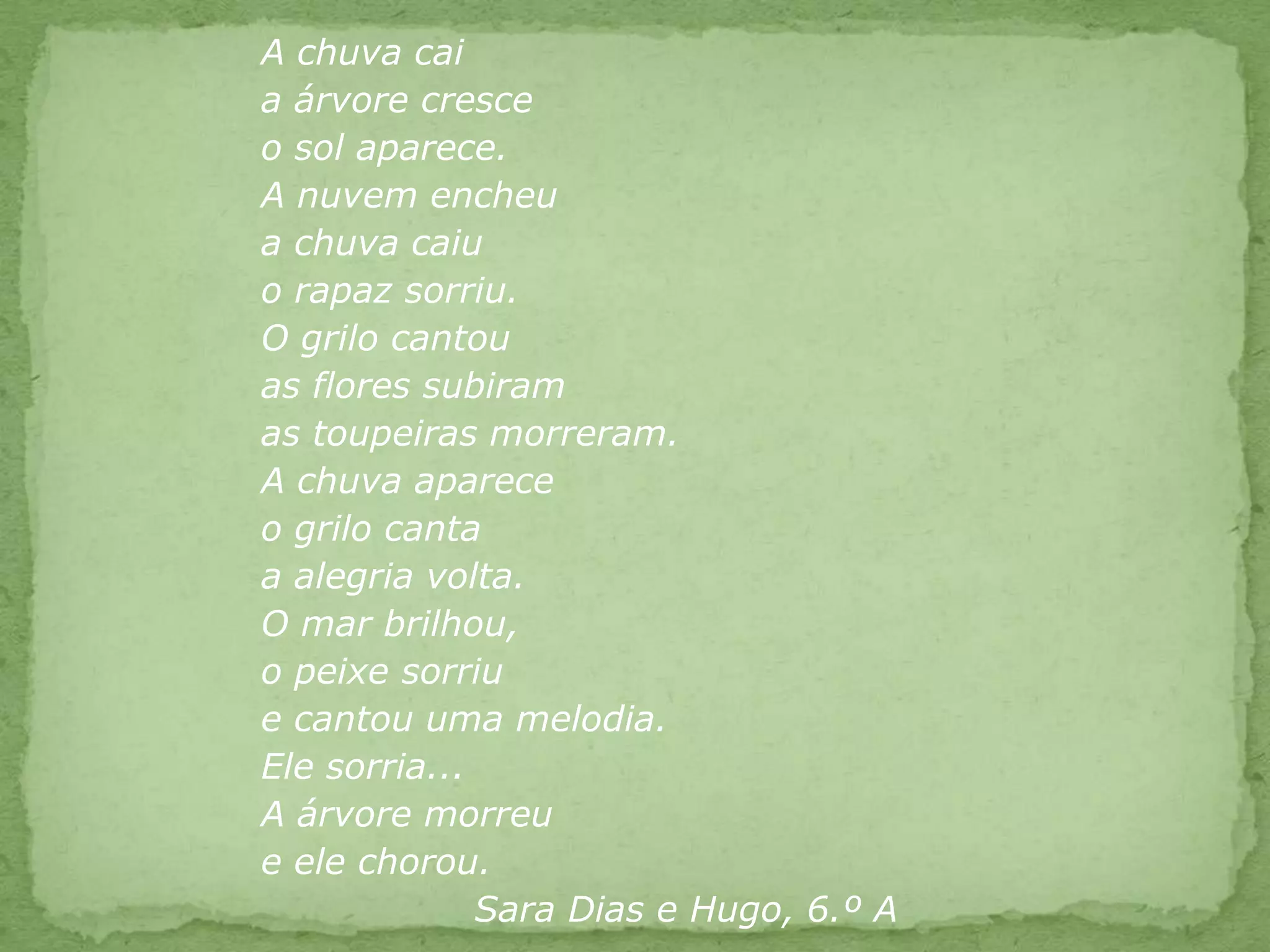 A chuva caiaárvore cresceo sol aparece.A nuvem encheua chuva caiuo rapaz sorriu. O grilo cantouas flores subiramas toupeiras morreram.A chuva apareceo grilo cantaa alegria volta.O mar brilhou,o peixe sorriue cantou uma melodia.Ele sorria...A árvore morreue ele chorou. Sara Dias e Hugo, 6.º A