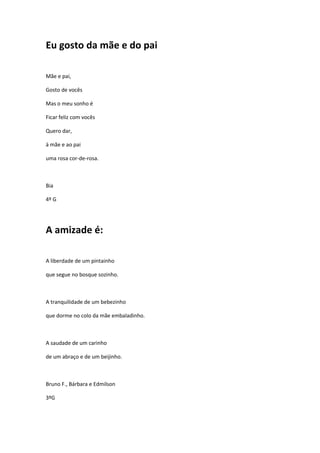 Este documento contém vários poemas curtos escritos por crianças sobre temas como alegria, mãe, amizade e São Valentim. Os poemas celebram esses conceitos através de linguagem simples e imagens positivas como sorrir, abraços e amor.
