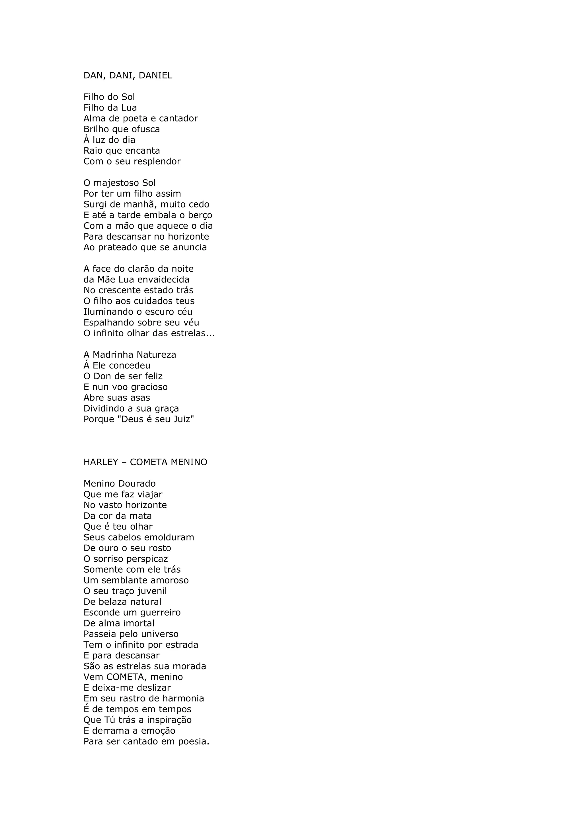 O documento apresenta poemas sobre diferentes temas como a natureza, crianças e flores. Os poemas descrevem de forma poética cenas como o sol e a lua, uma criança comparada a um cometa, uma mulher descrita como rainha do mar e uma flor chamada Lorena. Um dos poemas reflete sobre a vida, a morte e o descanso.