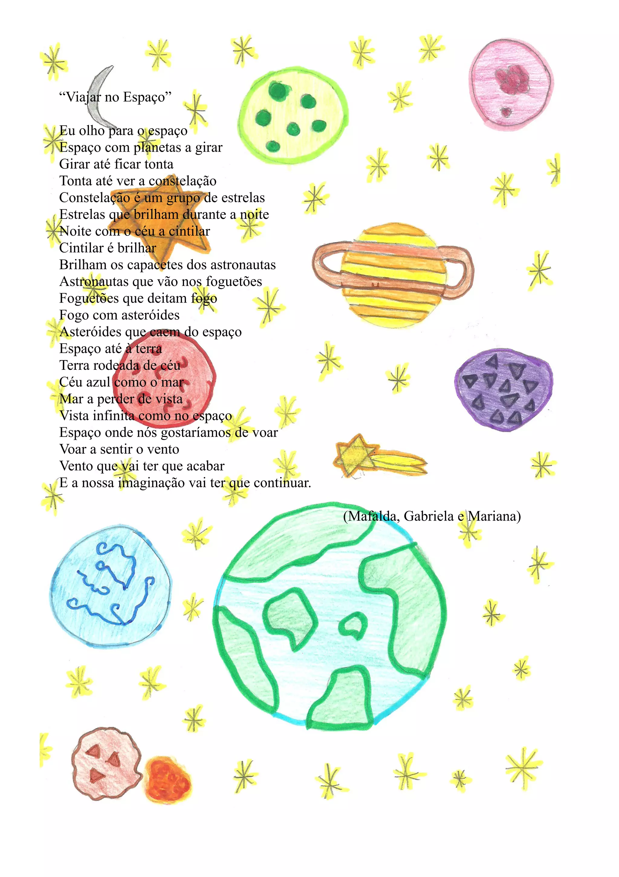O documento apresenta vários poemas sobre temas relacionados com o espaço, como planetas, estrelas, constelações e asteróides. As crianças usam a imaginação para descrever as maravilhas do universo e o desejo de viajar pelo espaço.