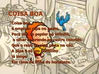 COISA BOA Coisaboa é empinar pipa no pasto. Para não se perder no infinito, o olhar se prende no rastro colorido Que o rabo da pipa pinta no céu. A pipa é só um pontinho lá longe Em cima da linha do horizonte.