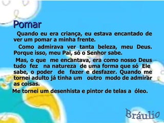 Pomar Quando euera criança, eu estava encantado de ver um pomar a minha frente. Como admirava ver tanta beleza, meu Deus. Porque isso, meu Pai, só o Senhor sabe. Mas, o que me encantava, era como nosso Deus tudo fez na natureza de uma forma que só Ele sabe, o poder de fazer e desfazer. Quando me tornei adulto já tinha um outro modo de admirar as coisas. Me tornei um desenhista e pintor de telas a óleo. Bráulio