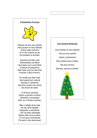 Este documento contém várias poesias sobre o Natal, incluindo sobre o nascimento de Jesus, as tradições de Natal como a ceia e a visita do Pai Natal, e as crianças se preparando para celebrar com presentes e comida. As poesias descrevem os símbolos e a alegria associados com esta época festiva.
