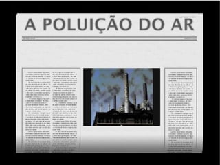 O documento discute vários tipos de poluição do ar, incluindo poluição atmosférica, chuvas ácidas, camada de ozono, efeito estufa e smog. Ele explica como cada um afeta negativamente o meio ambiente e a saúde humana e quais medidas podem ser tomadas para reduzir a poluição do ar.