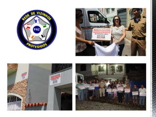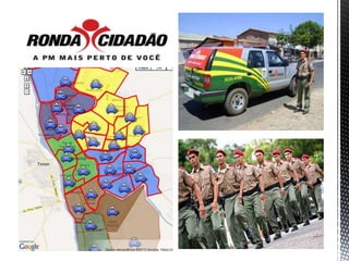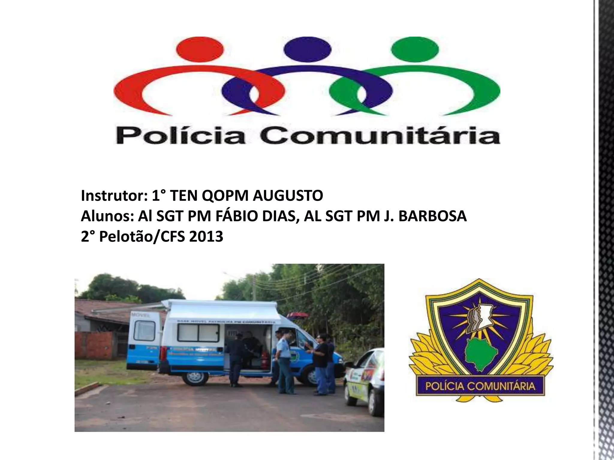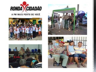 O documento discute a sociedade atual, o ideal da instituição policial, a polícia comunitária e o policiamento comunitário. Apresenta exemplos de projetos de polícia comunitária implementados em Piauí, Minas Gerais e Rio Grande do Sul com foco em parceria com a população e redução da criminalidade.