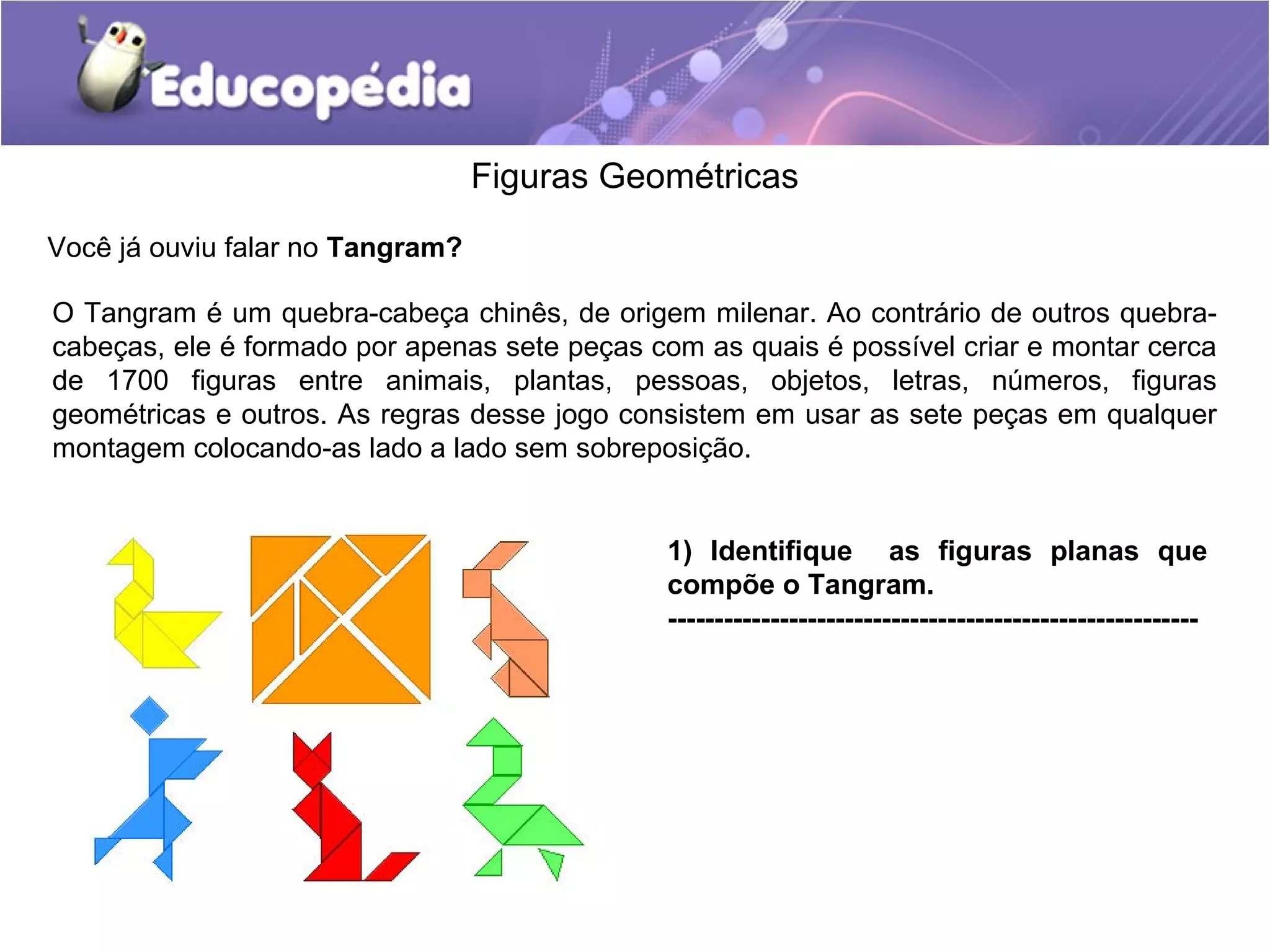 O documento discute figuras geométricas, incluindo o Tangram, que é um quebra-cabeça chinês feito de sete peças. Também fala sobre poliedros, que são figuras tridimensionais com várias faces, e dá exemplos como cubos e pirâmides. Por fim, faz perguntas sobre identificar formas geométricas em imagens e descrever suas características.