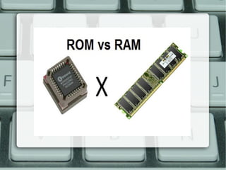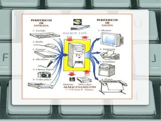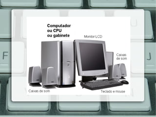 O documento discute conceitos básicos de hardware de computadores, incluindo suas partes principais como a unidade central de processamento, memória principal e periféricos de entrada e saída. Também explica os tipos de memória RAM e ROM e seus usos, além de apresentar exemplos comuns de periféricos como teclado, monitor e impressora.