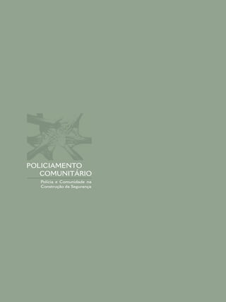 O documento apresenta um manual sobre policiamento comunitário no Brasil. Discute conceitos e características do policiamento comunitário, incluindo a importância da participação da comunidade e da reconstrução da confiança pública na polícia. Também descreve os passos para implementação do policiamento comunitário e apresenta exemplos de projetos comunitários.