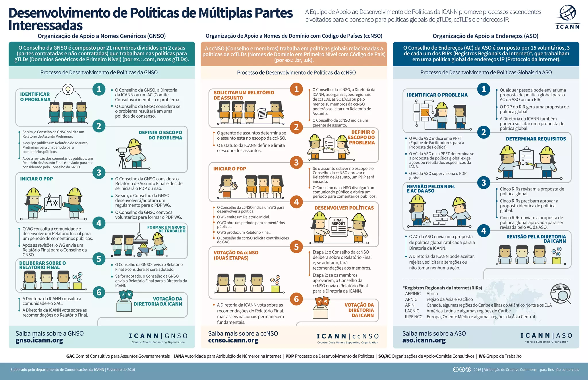 O documento descreve os processos de desenvolvimento de políticas de múltiplas partes interessadas na ICANN, incluindo a Organização de Apoio a Nomes Genéricos, a Organização de Apoio a Nomes de Domínio com Código de País e a Organização de Apoio a Endereços. Esses processos envolvem a identificação de problemas, a formação de grupos de trabalho, a elaboração de relatórios e a votação final pelos conselhos e diretoria da ICANN.