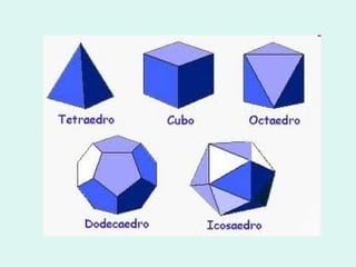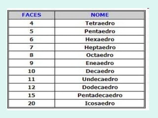 Poliedros são sólidos cuja superfície é formada por partes planas sem formas arredondadas. Eles possuem faces, vértices e arestas. Exemplos de poliedros incluem prismas, com bases paralelas, e pirâmides, com uma face inferior e vértice unindo faces laterais.