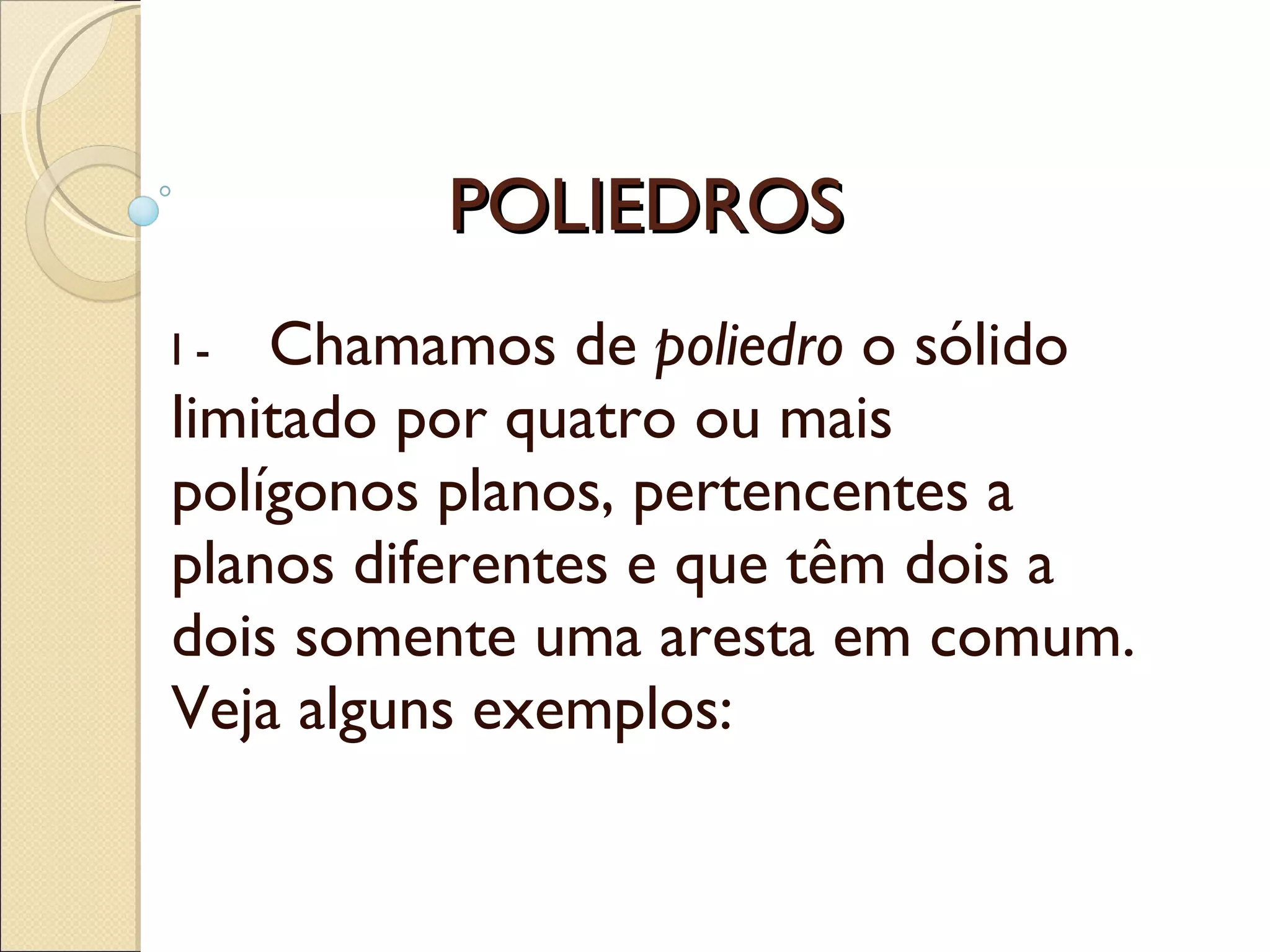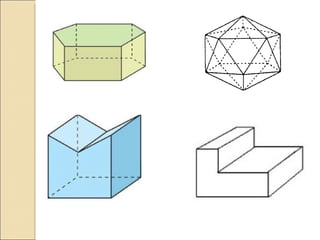 O documento discute poliedros, que são sólidos limitados por polígonos planos pertencentes a planos diferentes. Apresenta exemplos de poliedros convexos e côncavos, explica a relação de Euler e propriedades dos poliedros platônicos e regulares, que são subclasses especiais de poliedros convexos.