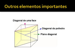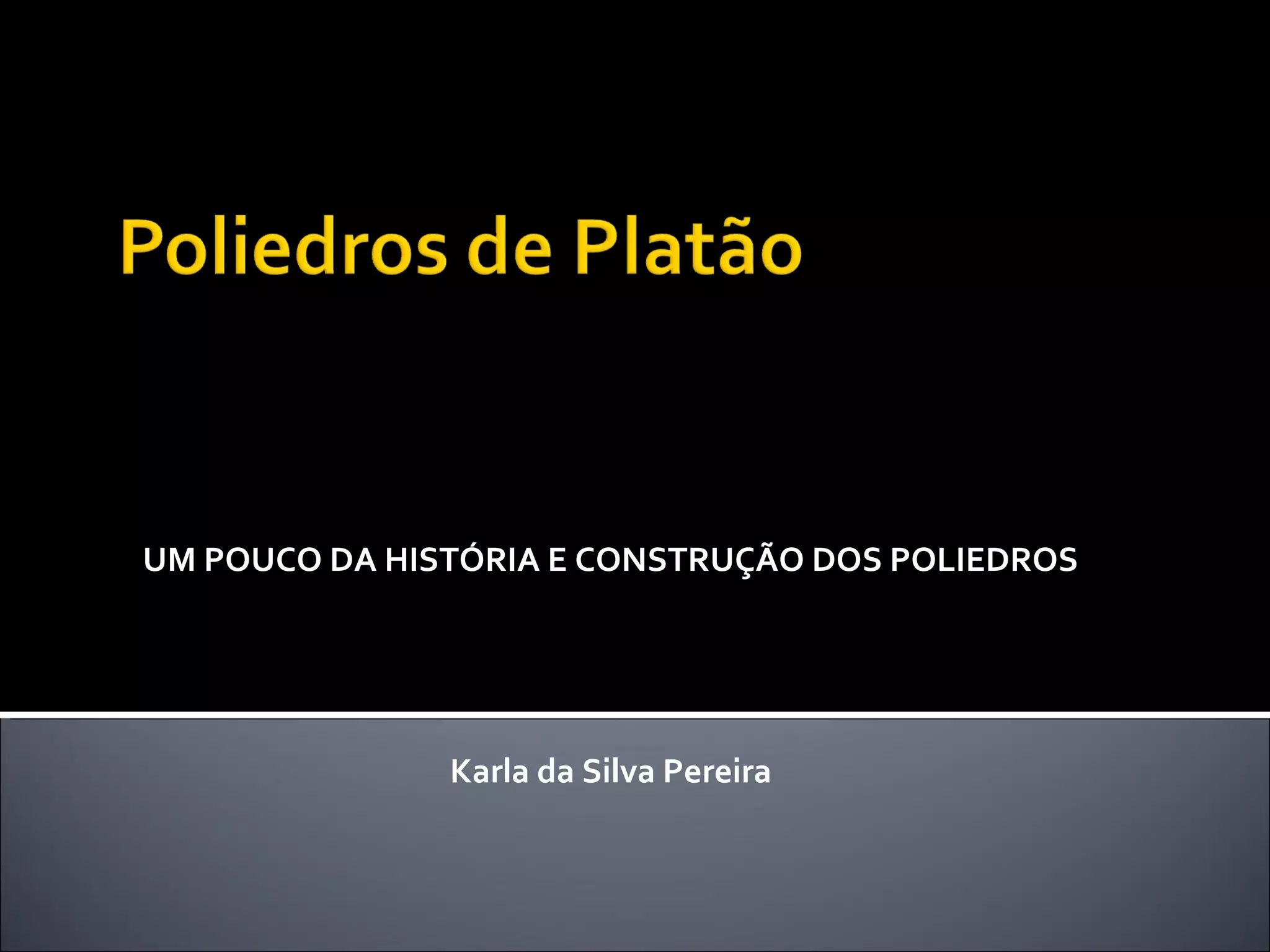 1) O documento discute a história e construção dos poliedros, figuras geométricas com quatro ou mais faces polígonais.