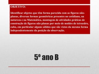 Este documento apresenta os objetivos e conteúdos de uma aula de geometria sobre poliedros e corpos redondos. Ele define poliedros como sólidos geométricos com faces planas e corpos redondos como sólidos que rolam por terem partes curvas. Detalha os principais poliedros, como prisma e pirâmide, e sugere atividades para identificar esses objetos no cotidiano.