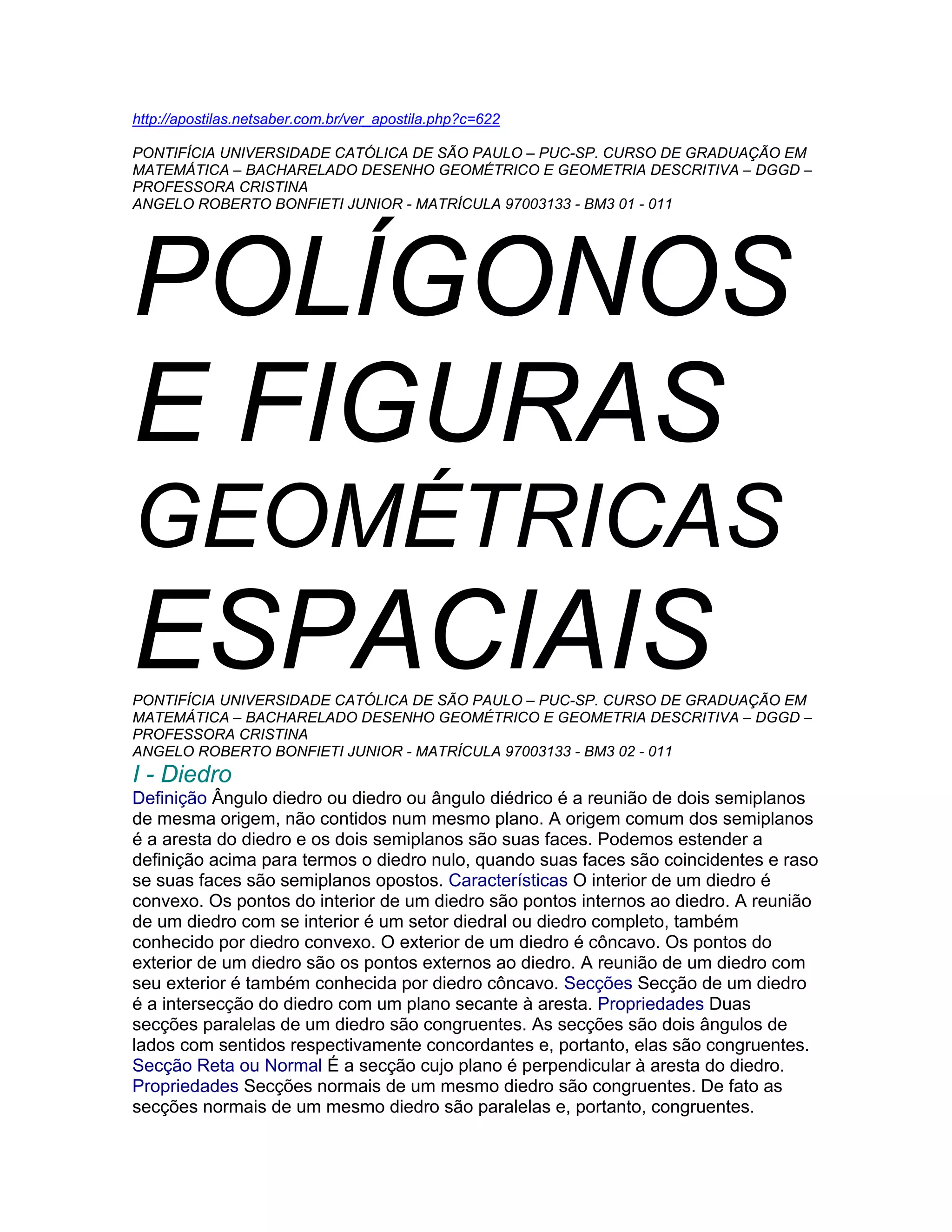 Este documento apresenta definições e propriedades de figuras geométricas no espaço como diedros, triedros, poliedros convexos e prisma. Inclui conceitos como natureza, elementos e seções destas figuras tridimensionais.