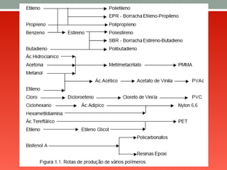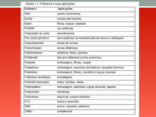Polímeros são macromoléculas formadas a partir da polimerização de moléculas menores chamadas monômeros. Existem polímeros naturais e sintéticos usados em diversas aplicações dependendo de suas propriedades. Os principais tipos de polímeros são classificados de acordo com sua estrutura, origem, reação de polimerização e disposição espacial dos monômeros.