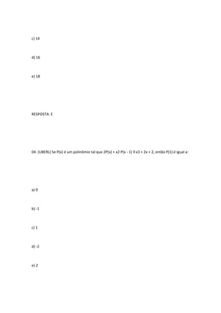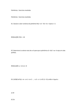 Este documento fornece sete exercícios resolvidos sobre polinômios. Os exercícios envolvem calcular valores numéricos de polinômios para valores específicos de x, determinar coeficientes para que um polinômio seja um cubo perfeito, encontrar o grau de um polinômio dado seu valor para um x, calcular o valor de um polinômio para um valor de x, encontrar as raízes de um quociente polinomial, determinar coeficientes para que um polinômio seja divisível por outro, e dividir um pol