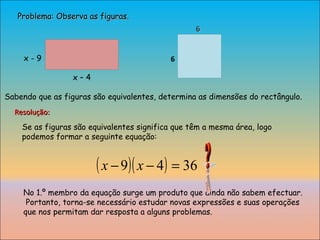 3) Operações com polinômios como adição, subtração, multiplicação e fatores comuns.