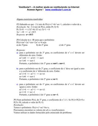 O documento descreve conceitos básicos sobre polinômios, incluindo: 1) definição de polinômio; 2) grau de um polinômio; 3) valor numérico de um polinômio; 4) divisão de polinômios. Exemplos ilustram como aplicar esses conceitos na resolução de exercícios.
