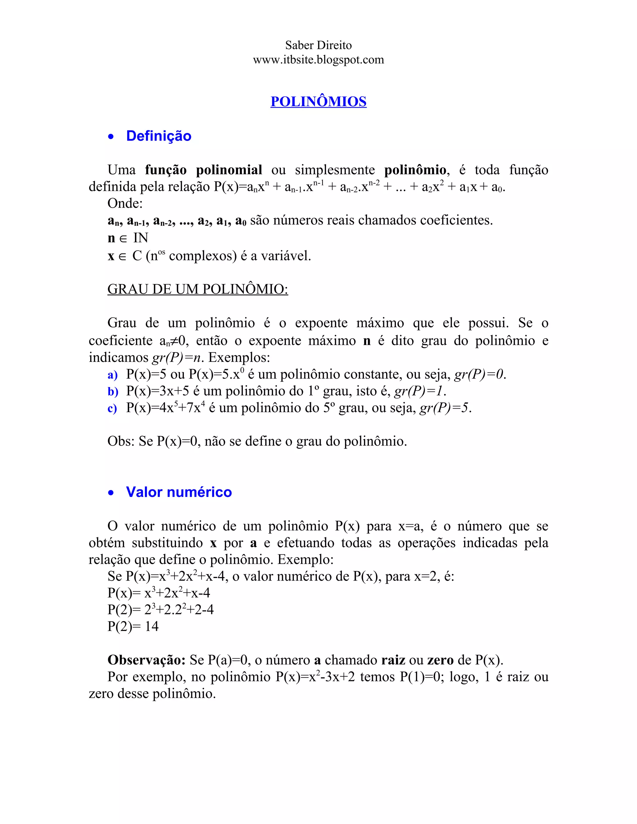 Saber Direito www.itbsite.blogspot.com POLINÔMIOS • Definição Uma função polinomial ou simplesmente polinômio, é toda função definida pela relação P(x)=anxn + an-1.xn-1 + an-2.xn-2 + ... + a2x2 + a1x + a0. Onde: an, an-1, an-2, ..., a2, a1, a0 são números reais chamados coeficientes. n ∈ IN x ∈ C (nos complexos) é a variável. GRAU DE UM POLINÔMIO: Grau de um polinômio é o expoente máximo que ele possui. Se o coeficiente an≠0, então o expoente máximo n é dito grau do polinômio e indicamos gr(P)=n. Exemplos: a) P(x)=5 ou P(x)=5.x0 é um polinômio constante, ou seja, gr(P)=0. b) P(x)=3x+5 é um polinômio do 1º grau, isto é, gr(P)=1. c) P(x)=4x5+7x4 é um polinômio do 5º grau, ou seja, gr(P)=5. Obs: Se P(x)=0, não se define o grau do polinômio. • Valor numérico O valor numérico de um polinômio P(x) para x=a, é o número que se obtém substituindo x por a e efetuando todas as operações indicadas pela relação que define o polinômio. Exemplo: Se P(x)=x3+2x2+x-4, o valor numérico de P(x), para x=2, é: P(x)= x3+2x2+x-4 P(2)= 23+2.22+2-4 P(2)= 14 Observação: Se P(a)=0, o número a chamado raiz ou zero de P(x). Por exemplo, no polinômio P(x)=x2-3x+2 temos P(1)=0; logo, 1 é raiz ou zero desse polinômio.