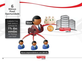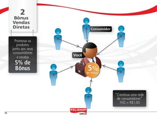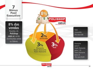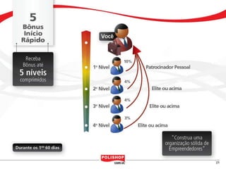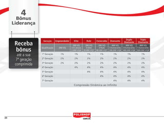 O documento descreve os níveis de patrocínio e benefícios de uma empresa de marketing multinível. Os níveis variam de Rubi a Diamante e oferecem bônus iniciais, comissões sobre vendas e bônus de liderança. Os níveis mais altos como Diamante podem gerar ganhos mensais de até R$82.306,80 através de comissões e bônus.