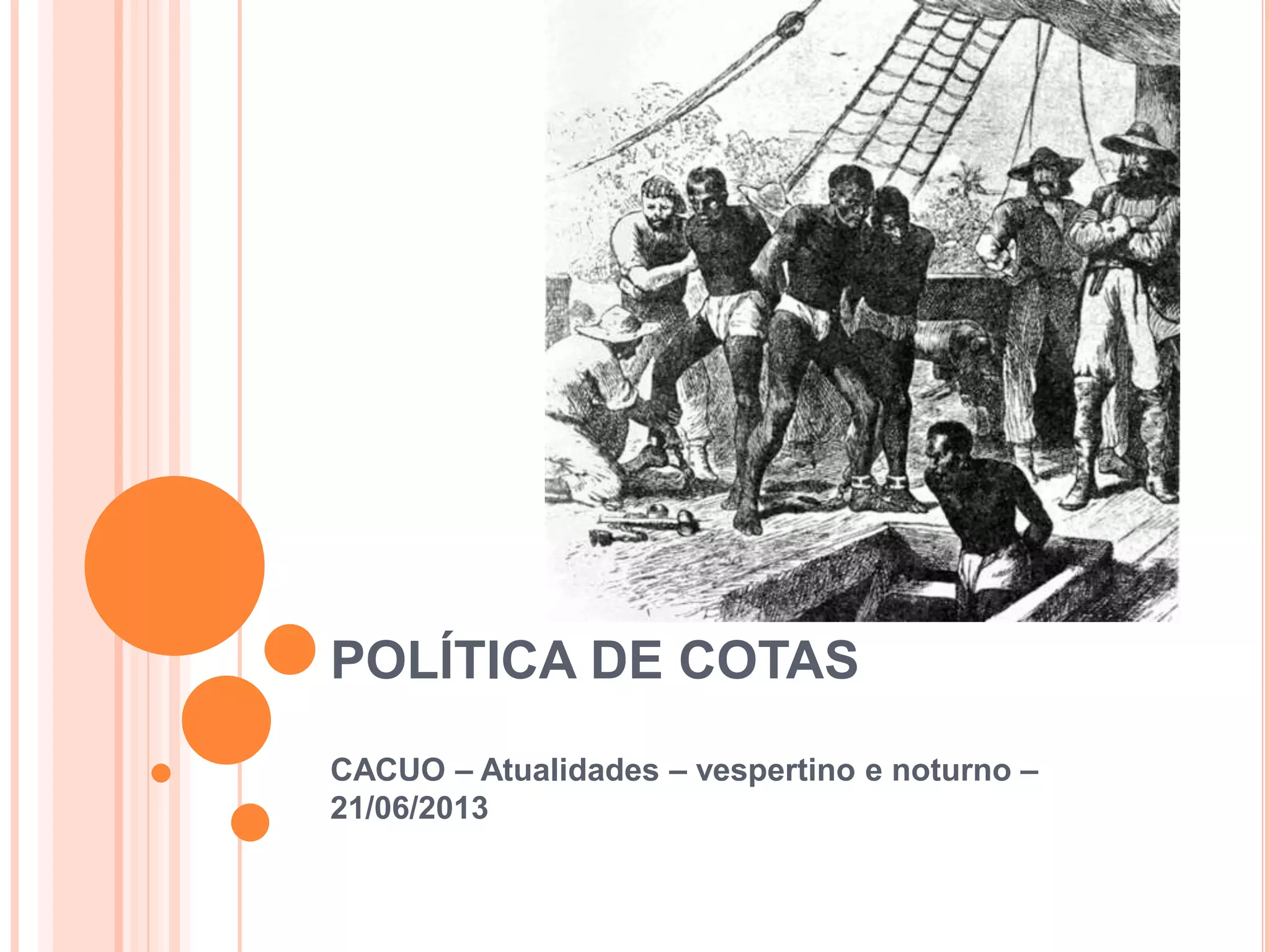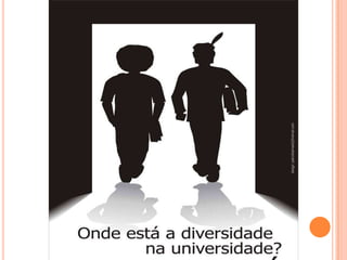 O documento descreve a história da escravidão no Brasil, da era colonial até a abolição em 1888, e como isso levou à dívida histórica com afrodescendentes e indígenas. Também discute o contexto das cotas raciais no ensino superior, incluindo críticas e modelos de implementação nas universidades federais.
