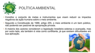 Este documento discute as políticas ambientais brasileiras, sua evolução histórica e os principais órgãos envolvidos. Aborda também a legislação ambiental em Roraima e os impactos da mineração no meio ambiente.