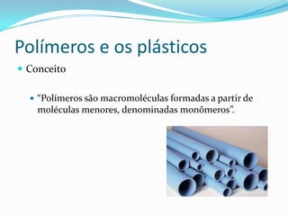 O documento discute os conceitos de polímeros e plásticos. Define polímeros como macromoléculas formadas por moléculas menores chamadas monômeros através de uma reação de polimerização. Classifica os polímeros em naturais ou artificiais e por método de obtenção, como adição ou condensação. Fornece exemplos de polímeros comuns como PVC, Teflon, polietileno e náilon e suas aplicações.