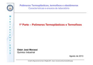 O documento descreve um minicurso sobre polímeros termoplásticos, termofixos e elastômeros ministrado por Odair José Morassi em São Paulo nos dias 9 e 10 de agosto de 2013, abordando características e ensaios de laboratório destes polímeros.