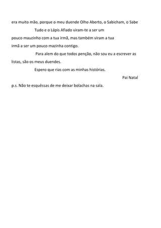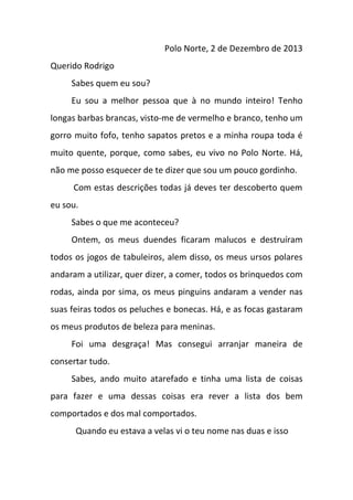 Pai Natal escreve uma carta a Rodrigo contando sobre os problemas que teve no Polo Norte, onde seus duendes destruíram brinquedos e seus animais comeram outros brinquedos. Ele também menciona ter visto o nome de Rodrigo em ambas as listas de comportamento, mas que na verdade são seus duendes que escrevem as listas.