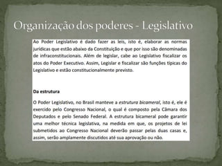 O documento discute a natureza do poder do Estado moderno de acordo com Max Weber, definindo-o como centralizado, impessoal e determinado sobre um território específico. Também aborda os elementos constitutivos do Estado como território, população e governo, além de explicar diferentes tipos de constituição como escrita e não-escrita.