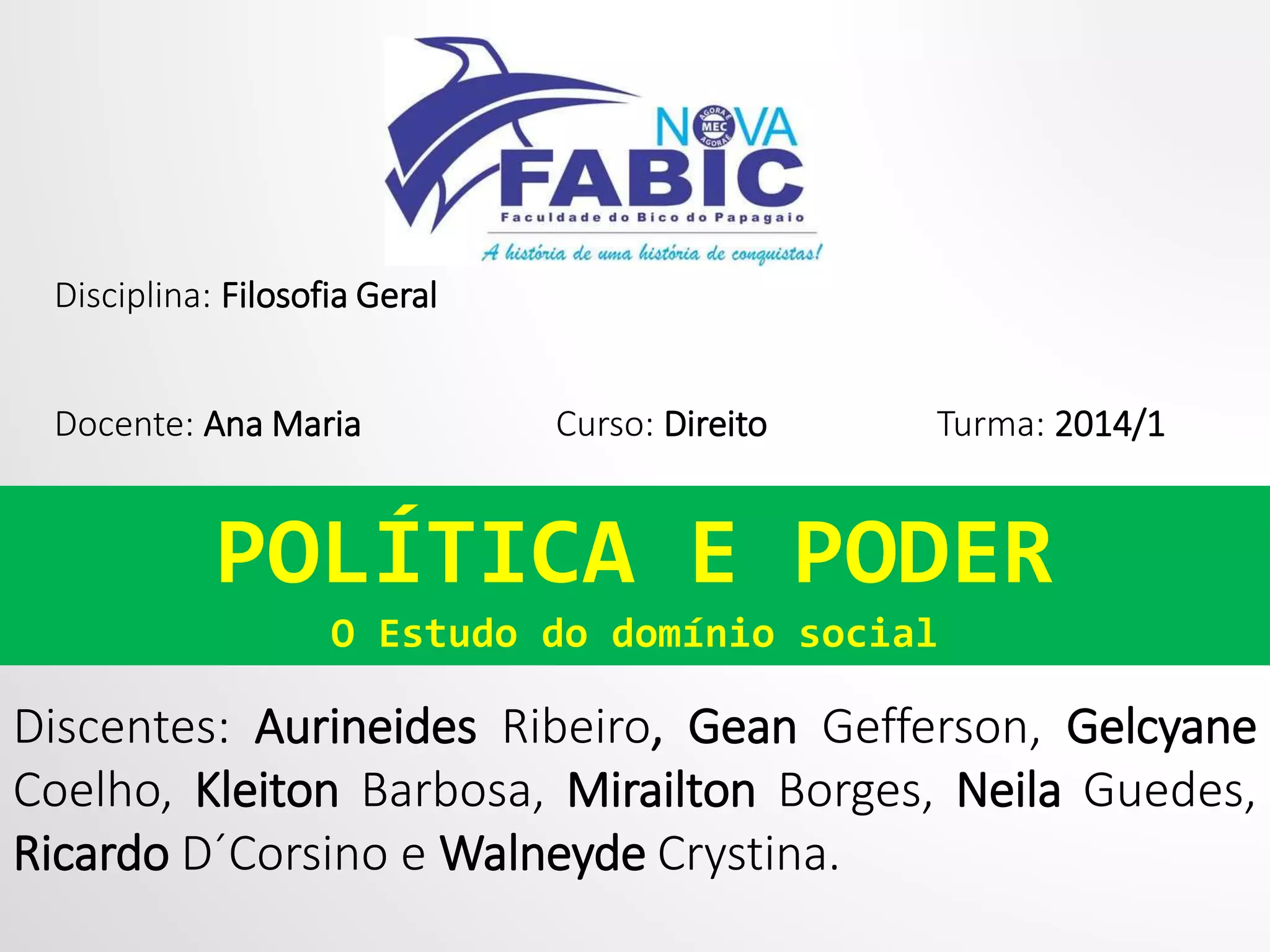 Este documento descreve uma aula sobre política e poder ministrada para alunos de Direito. A aula discute conceitos como política, filosofia política e poder, abordando as três formas de poder social - poder econômico, ideológico e político - e argumenta que o poder político é o principal por controlar os instrumentos de coerção social.