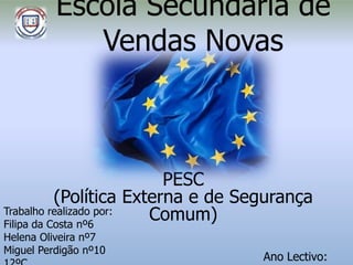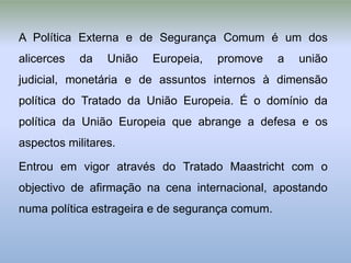 Este documento descreve a Política Externa e de Segurança Comum (PESC) da União Europeia. A PESC promove a cooperação internacional entre os estados-membros e objetivos como a manutenção da paz e dos valores europeus. No entanto, o processo decisório intergovernamental dificulta o consenso entre os países.