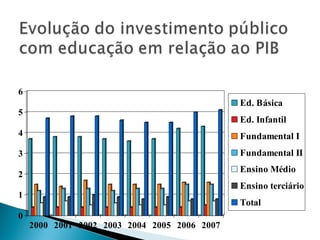 O documento descreve a evolução histórica do sistema de ensino brasileiro desde os jesuítas até a Constituição de 1988. A educação inicialmente era restrita à elite, mas houve progressiva expansão com o tempo, embora o ensino público ainda seja seletivo e de baixa qualidade, levando muitos à educação privada.