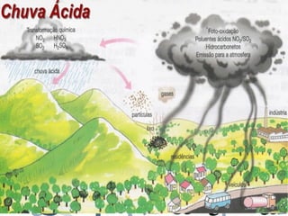 Este documento discute os temas da poluição do ar e chuvas ácidas. Ele explica que a poluição do ar é causada principalmente pela queima de combustíveis fósseis e tem impactos negativos na saúde humana e no meio ambiente. Também descreve como os gases de enxofre e nitrogênio reagem com a água para formar chuvas ácidas, que danificam florestas e lagos.