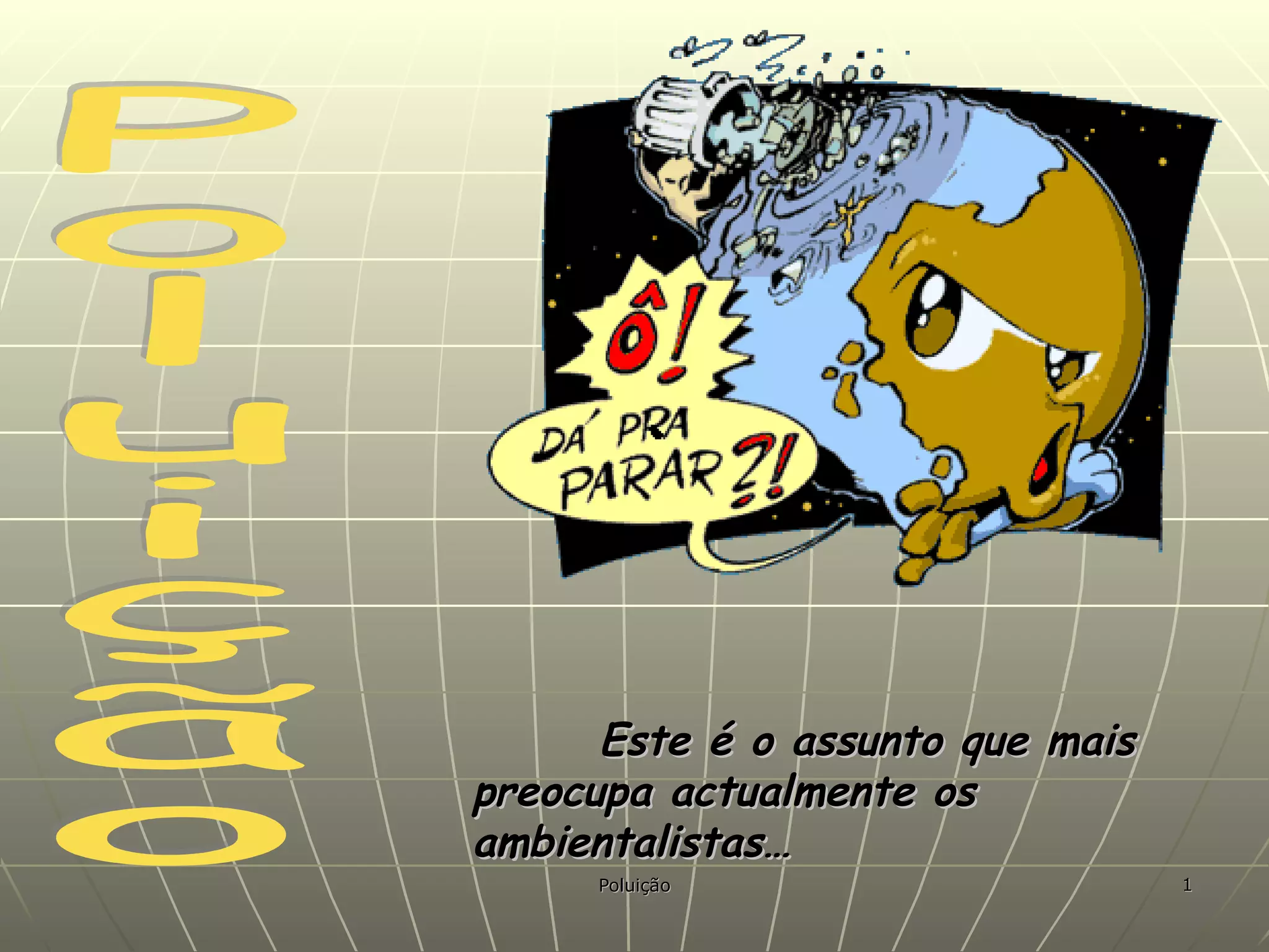 O documento discute os principais tipos de poluição que preocupam os ambientalistas: poluição atmosférica, poluição do solo e poluição da água. A poluição atmosférica é causada principalmente pela queima de combustíveis fósseis e tem consequências graves como a destruição da camada de ozônio. A poluição do solo é causada por resíduos industriais e agrícolas. A poluição da água é causada por esgotos, pesticidas e resíduos tóxicos, colocando em risco a saúde