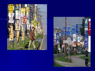 Poluição visual Outragrande fonte de poluição, principalmente nos meios urbanos é a poluição visual . As imagens de outdoors, cartazes, e diversos outros meios de comunicação servem para transmitir informações, entretanto, o uso excessivo destes recursos pode ser considerado poluição. O tema “poluição visual” é algo ainda bastante novo e, talvez por isso, ainda muito controverso. De um lado, estão os que defendem que o excesso de propagandas e informações causa inúmeros problemas (como stress, desconforto visual, distração para os motoristas, etc.) e de outro estão aqueles que acreditam que isso tudo não passa de um “policiamento estético” do meio urbano.