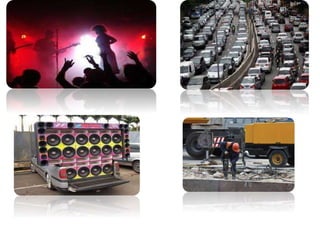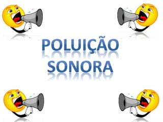 A poluição sonora é causada por níveis excessivos de ruído que afetam a saúde física e mental. O nível máximo recomendado pela OMS é de 50 decibéis, e acima disso é considerado prejudicial. Fontes comuns de ruído alto incluem transporte, construção, máquinas e aparelhos de som. A exposição frequente a alto volume pode causar perda auditiva. O excesso de ruído causa problemas de saúde como dor de cabeça e estresse.