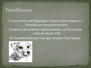 O documento descreve o pontilhismo, uma técnica pictórica surgida no século XIX na França onde a imagem é formada por pequenos pontos. Georges Seurat foi o principal expoente desta corrente, destacando-se suas obras Tarde de Domingo na Ilha de Grande Jatte e a inacabada O Circo, nas quais aplicou de forma refinada a técnica do pontilhismo.