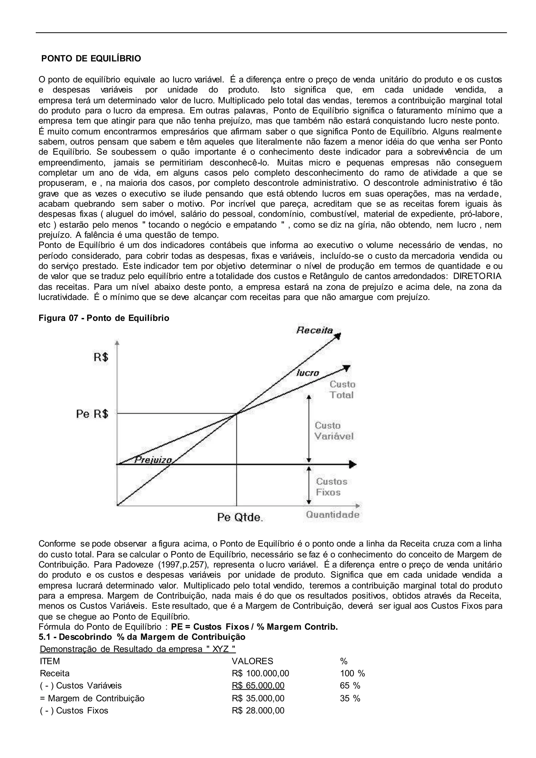 O documento explica o que é ponto de equilíbrio, que é o volume de vendas mínimo necessário para que a receita cubra os custos fixos e variáveis, sem gerar lucro ou prejuízo. Também discute a importância de entender esse conceito para a sustentabilidade dos negócios, e apresenta diferentes métodos para calcular o ponto de equilíbrio, como o contábil, econômico e financeiro.