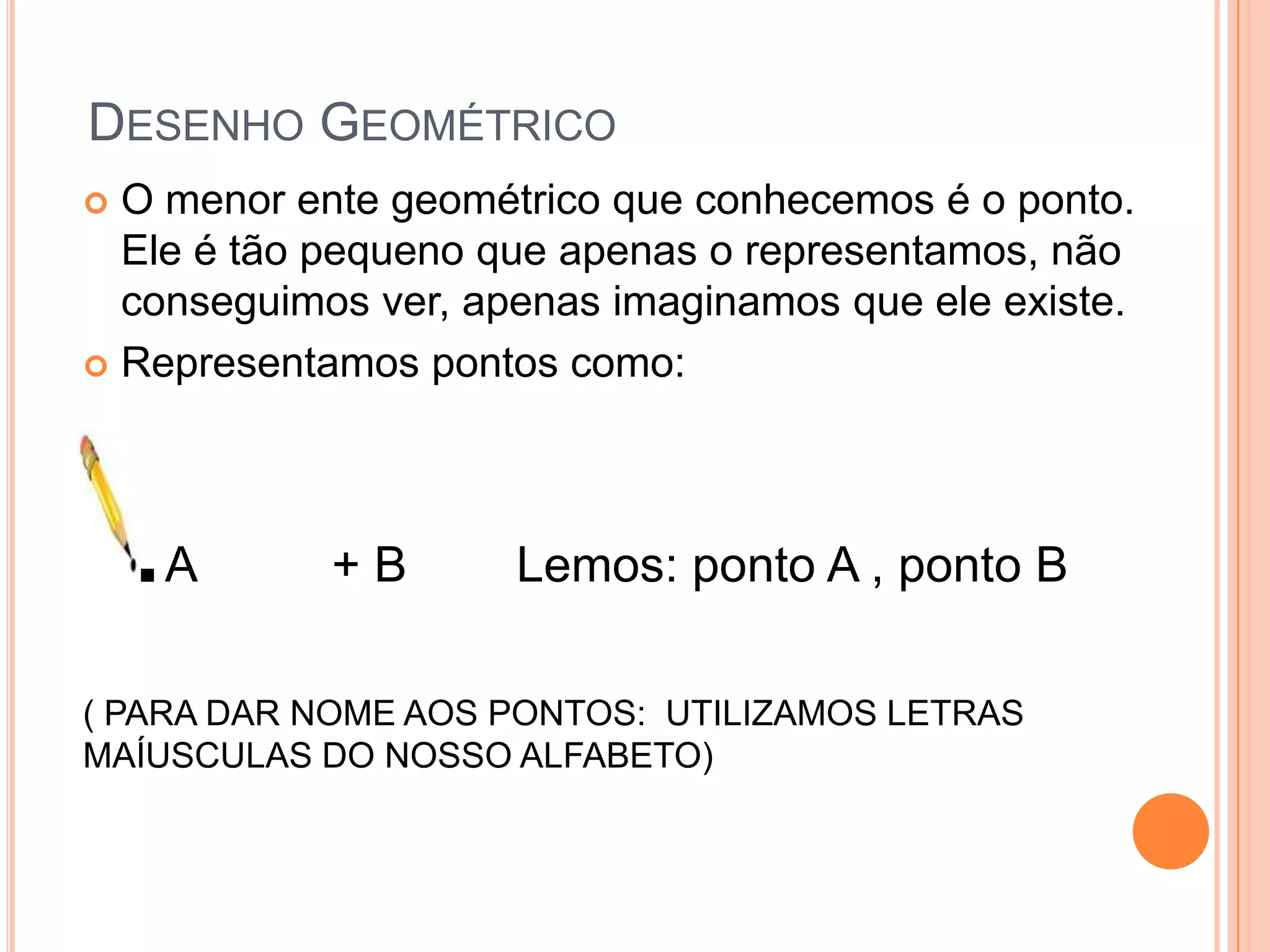 O documento descreve os elementos geométricos básicos como pontos, linhas e suas propriedades. Pontos são os menores elementos e representam locais na geometria. Linhas conectam pontos e podem ser retas, curvas ou quebradas. O documento também discute as propriedades dessas linhas como espessura, traçado e se são infinitas, semifinitas ou segmentadas.
